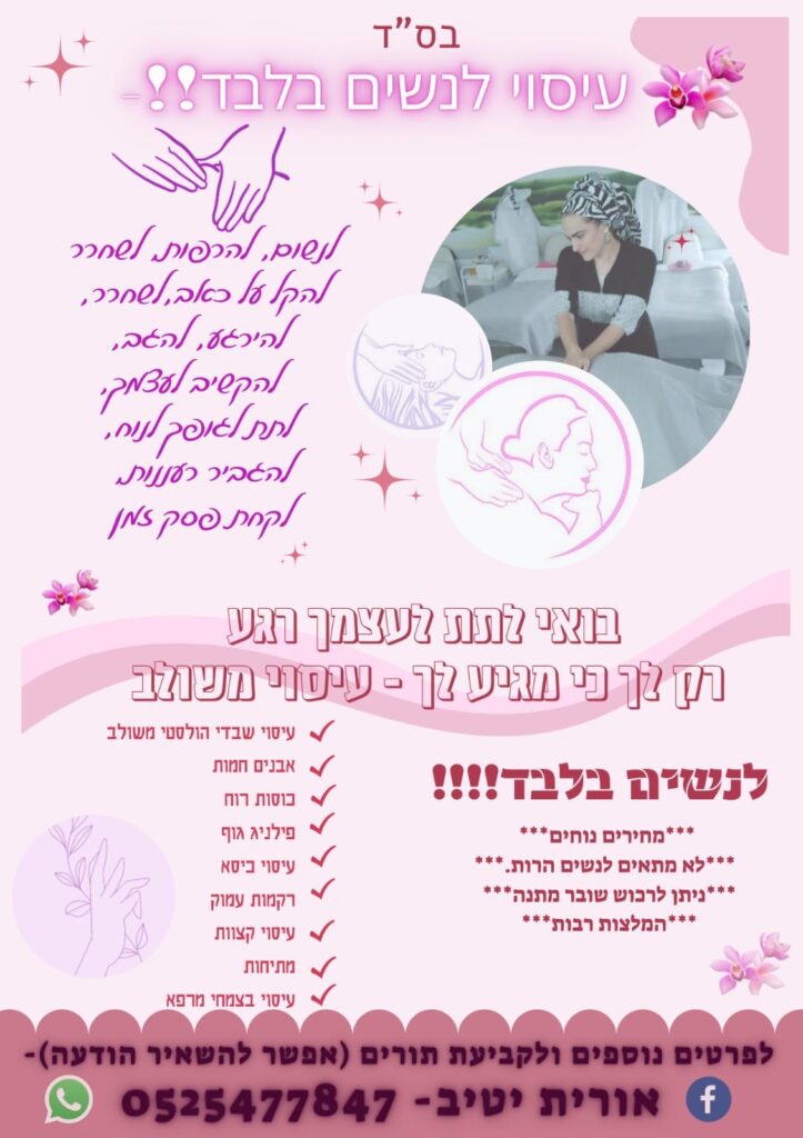 אנאל, בת 30, מטפלת מקצועית ברפלקסולוגיה ועיסוי קלאסי, רגוע ושקט. מטפלת בתל אביב, יש חניה חופשית. צרו קשר לתאום טיפול מ-11 בבוקר. אין מענה להודעות ולא עונה למספרים חסויים.